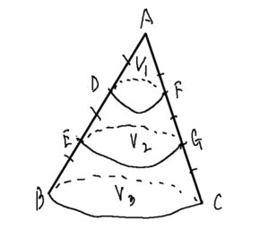 ABを三等分し、底面に平行に切る。その時V1:V2:V3を求めよ。